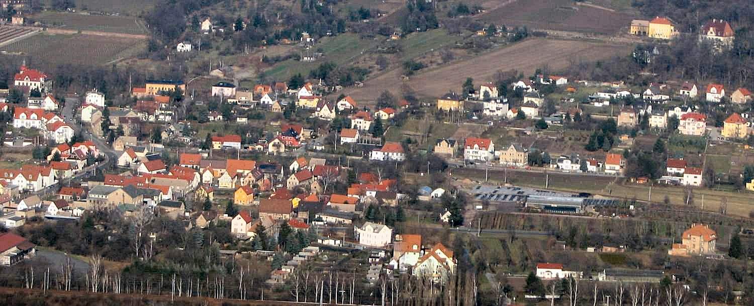 Das aktuelle Bild der Woch zeigt eine Luftaufname von Radebeul-Zitzschewig. Im Zentrum des Panoramas sieht man Altzitzschewig sowie die Gartenanlagen der Baumschule Schumann, Links schlängelt sich die Gerhart-Hauptmann-Straße. Ganz rechts oben ist noch das Hohenhaus zu sehen.